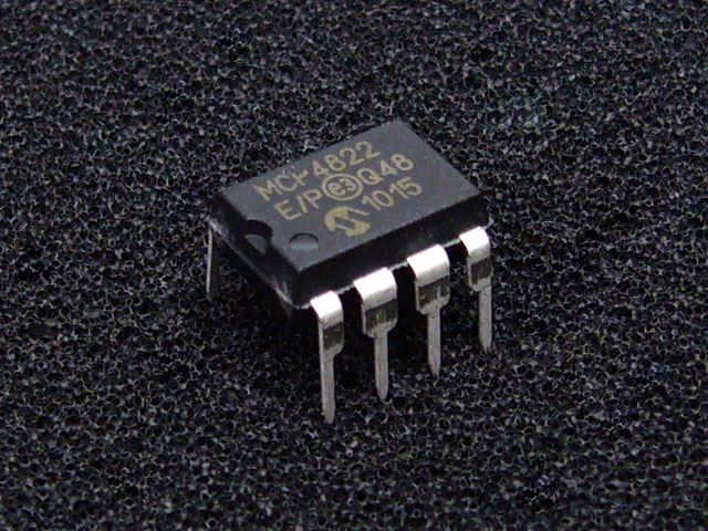 MCP4822-E/Pは、SPIシリアルインターフェースを持つ2chのシリアルD/Aコンバータです。これまでPWMを利用してアナログ出力を発生させていたのを専用ICの置き換えることで設計が楽になります。