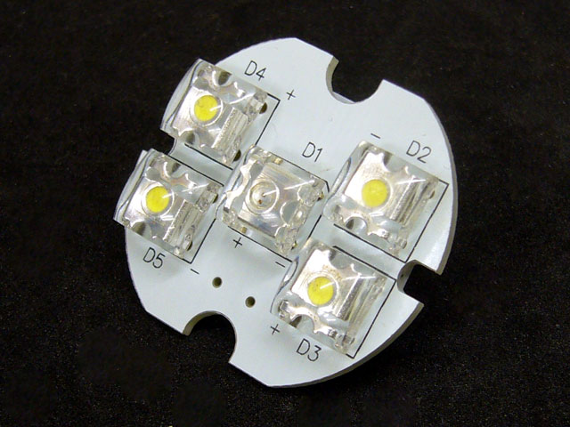 ちょっとめずらしいLEDモジュールです。ど真ん中に2Chip赤色SUPER FLUX LEDが1個、周囲に3Chip白色SUPER FLUX LEDが4個搭載されています。写真は輝度を抑えて撮影しています。