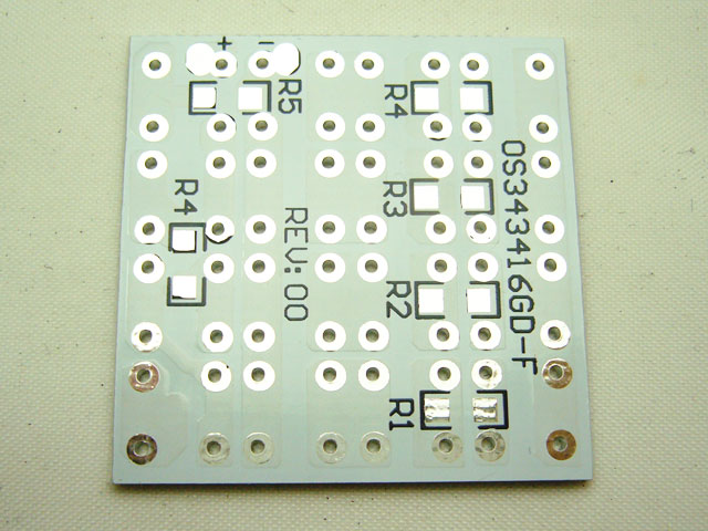 SUPER FLUX LEDモジュールの基板のみも販売しておりますので、白色や電球色以外の発光色を使用してオリジナルLEDモジュールも製作が可能です!抵抗は裏面に3216サイズのチップ抵抗が実装できるようになっております。SUPER FLUX LED×16個実装モジュール基板(両面ガラス基板)