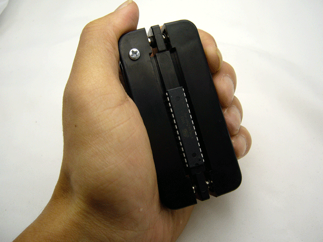 広がっているICの足を真っ直ぐに矯正し、基板やICソケットにスムーズに挿入しやすくするための工具です。