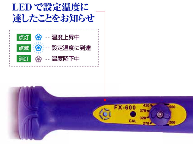 視覚的に、こて先温度の状態がわかるLEDインジケータ付きです。LEDインジケータの動作は以下の通りです。・LED点灯:温度上昇中