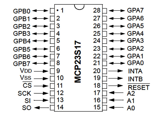 両者の違いはインターフェイスがMCP23017が2線式のI2C、MCP23S17が3線式のSPIです。シリアルインターフェイスを持ったデバイスであればPICやAVR 、Arduinoなど種類を問わずI/Oポートを16本増設できます。