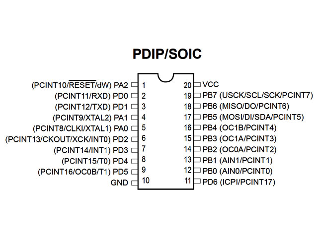 ATtiny2313Aに比べてメモリ容量が2倍に増えた以外、機能的にはATtiny2313Aと同じです。