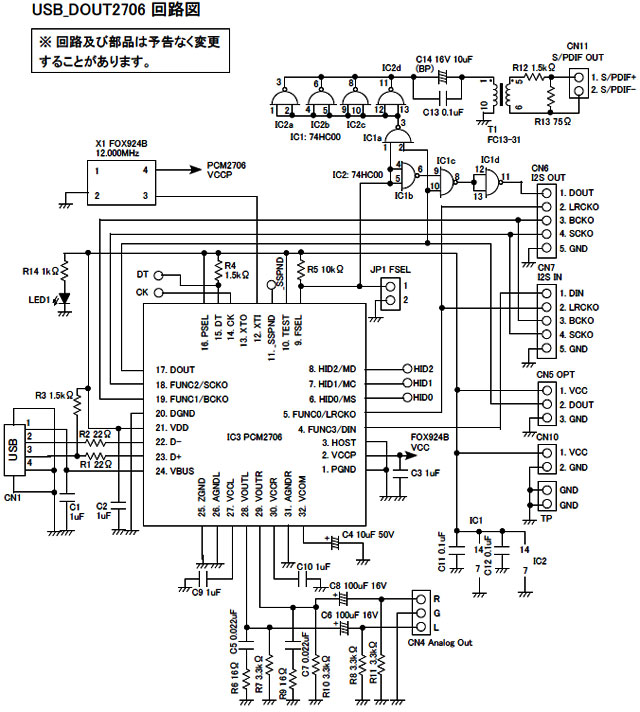 PC等のUSB出力からオーディオシリアル信号(Audio PCM信号)への変換はT.I.社のPCM2706を実装した,