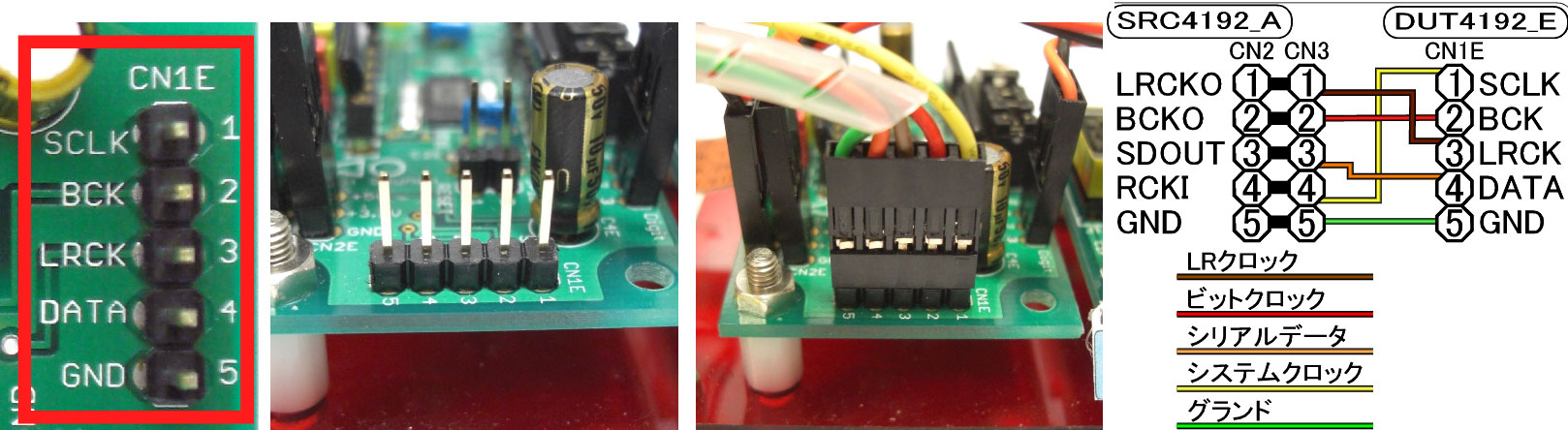 DIT4192_E基板の右の5ピンヘッダピンCN1EにSRC4192_Aからのオーディオシリアル信号(176.4kHz 24bit I2S)とシステムクロック(22.57954MHz)を入力接続します。