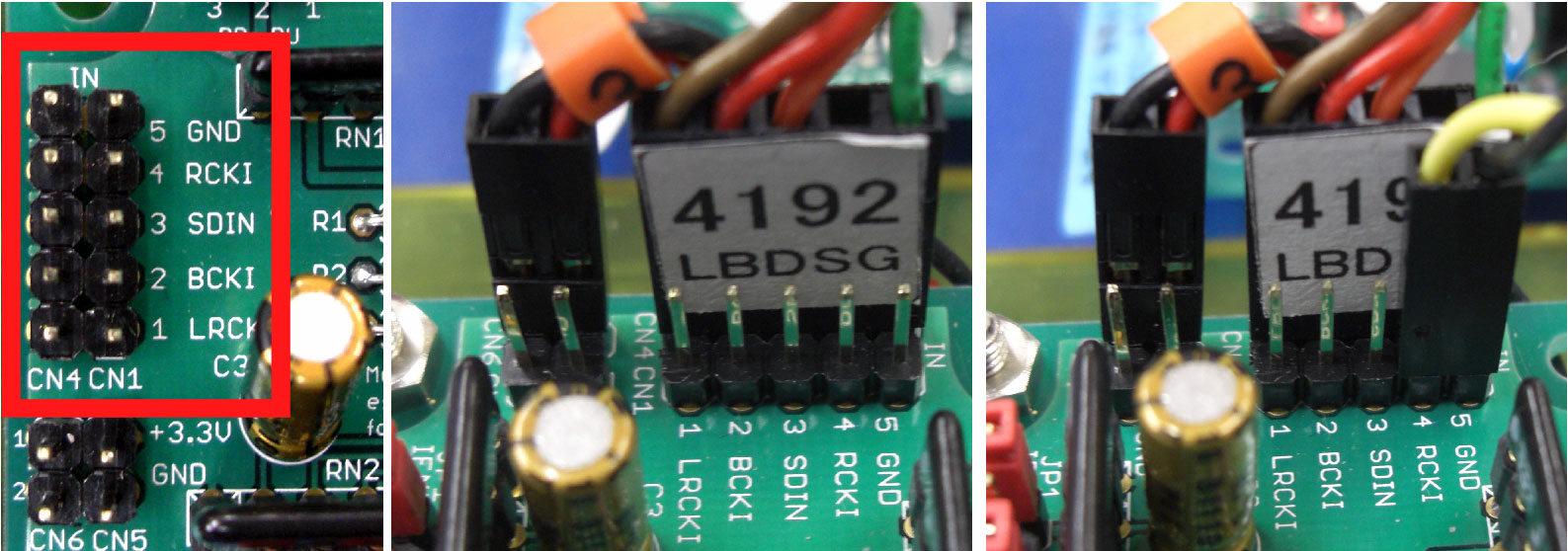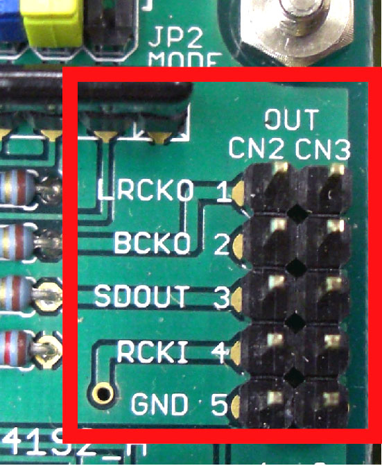 DIT4192_Eへのオーディオシリアル信号(176.4kHz 24bit I2S)とシステムクロック(22..5792MHz)の出力箇所は基板右側に5ピンヘッダピンCN2とCN3です。(CN2とCN3はどちらも同じ信号出力です。)