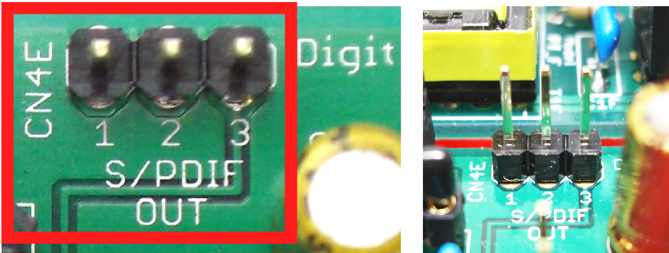 ●1:1同軸パルストランスへのS/PDIF信号(176.4kHz 24bit)の出力箇所は基板の右上の3ピンヘッダピンCN4Eの1番ピンと3番ピンです。●電源はDC3.3VとDC5Vです。