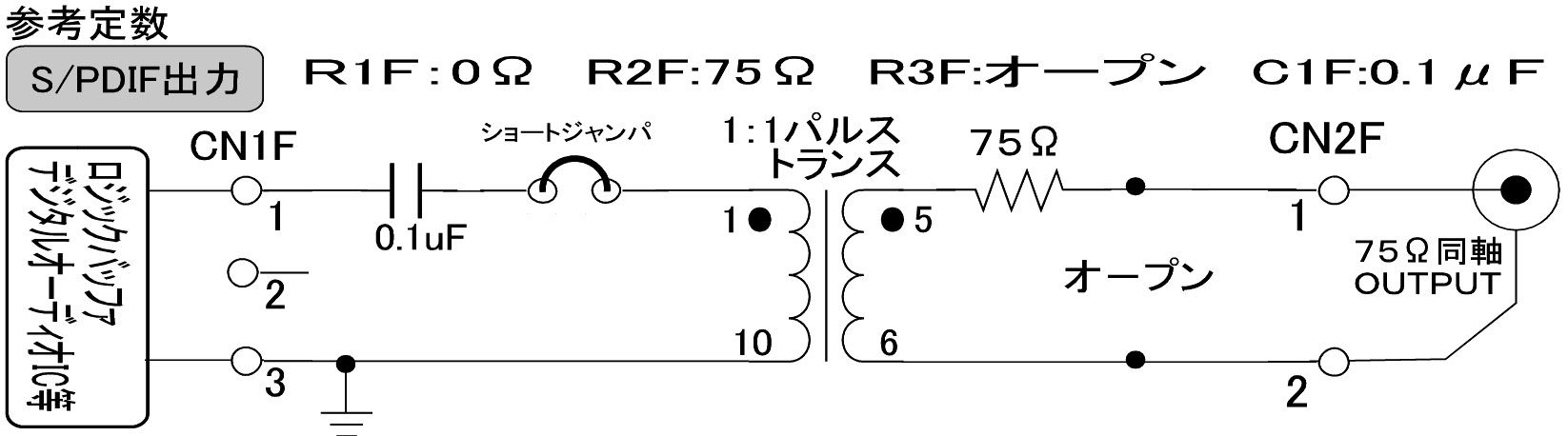 デジタルオーディオシリアル信号をデジタルオーディオ信号(S/PDIF)へ変換して同軸用パルストランスを通じて同軸出力します。DAIトランスミッタ部にはT.I.社のDIT4192を実装したDIT4192_E基板と同軸パルス用PT_F基板を使用します。