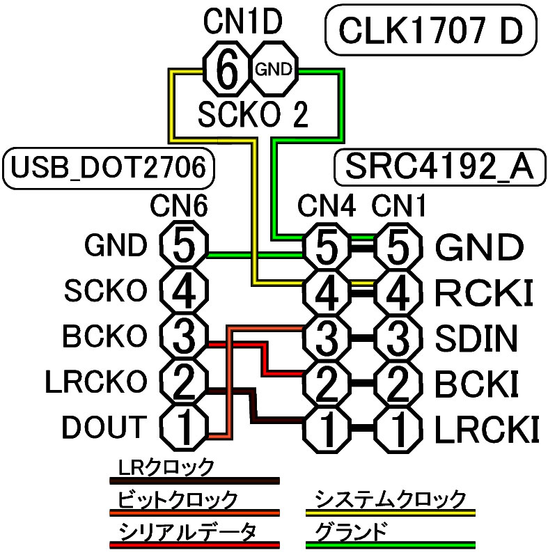 今回システムクロックはCLK1707_D基板から入力しますのでUSB_DOUT2706からの接続はオーディオシリアル信号(LRクロック・ビットクロック・オーディオデータ)とGNDの4本です。