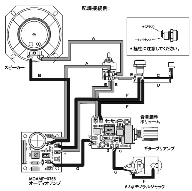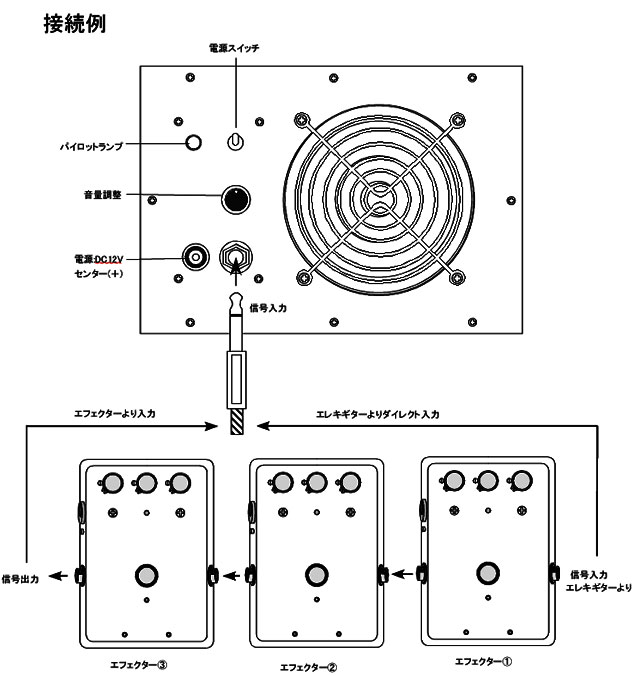 ギターアンプキット単体では歪みの少ないクリーントーンで出力するため、音を歪ませる場合は、デジットオリジナルのギターエフェクターキット「ディレイ」・「オーバードライブ」・「ディストーション」や、お手持ちの各種エフェクター等と接続して使用してください。