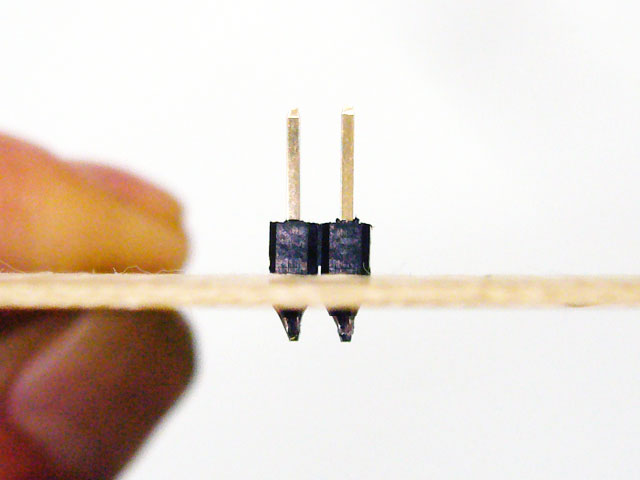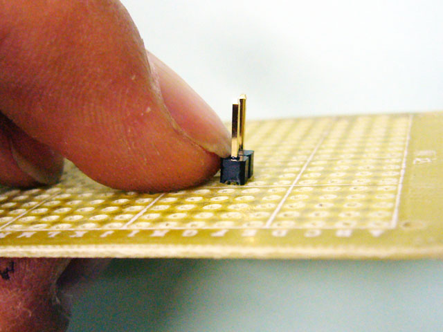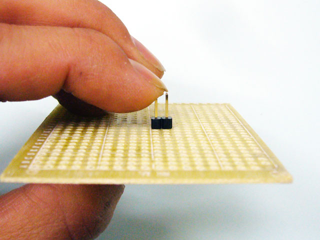 まずヘッダーピンを基板にさして、2本あるうち、片方のピンを指で押さえて固定しておきます。力んで押さえると指が痛いので、軽く押さえてください。