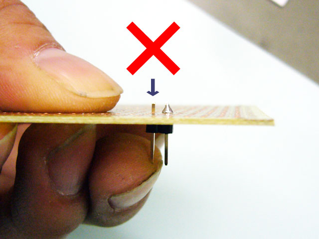 馴れないうちは、仮ハンダしたヘッダーピンが、このように斜めになってしまうこともありますので、これを修正します。