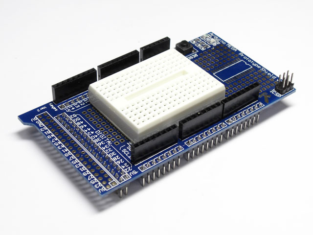 Arduino(MEGA)での試作や実験に便利な、小型のブレッドボードが付属したArduino用と、ArduinoMEGA用のプロトシールドが入荷しましたのでご紹介いたします。