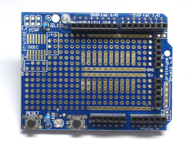 Arduino用プロトシールドには、基板に電源ラインのパターンが入っていますので、回路を組む時に便利そうです。