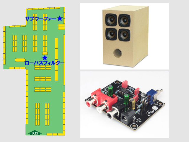 ▼サブウーファー組み立てキットとローパスフィルター基板は