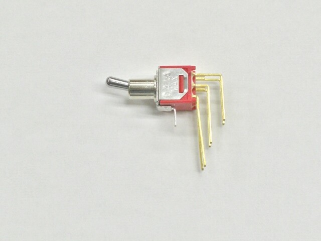 基板ピッチでそのまま基板に差して半田付けができる、2回路2接点L型の小信号用トグルスイッチが入荷しました。