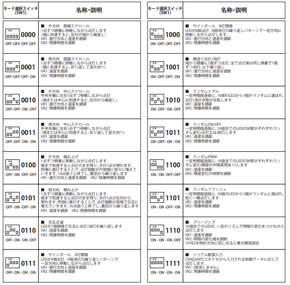 こちらのキットではDIPスイッチにより16種類の点灯モードプリセットが用意されています。