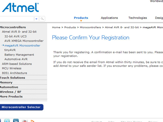 「Please Confirm Your Registration」というページが表示されると、登録したE-Mailアドレス宛にダウンロードページのURLを記載したメールがAtmelより送信されますので、メールを受信して開いてください。