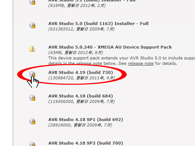 ページが切り替わり、今度は「AVR Studio 4.19 (build 730)」(図の赤○印)を見つけ、その横にあるCDマークをクリックします。