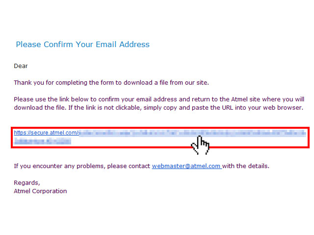 「Please Confirm Your Registration」というページが表示されると、登録したE-Mailアドレス宛にダウンロードページのURLを記載したメールがAtmelより送信されますので、メールを受信して開いてください。11:Atmelから届いたE-mail