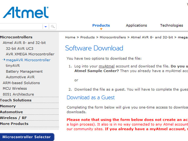 Atmelのホームページが小変更やリニューアルで大幅変更した場合、ここでご紹介した方法でダウンロードできなくなる可能性がございます。