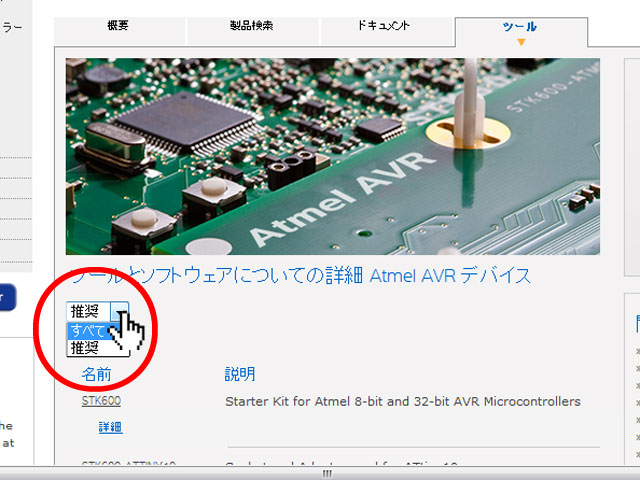 コンテンツ一覧内の「Atmel 8ビット・32ビット AVR」をクリックします。3:「ツール」をクリック